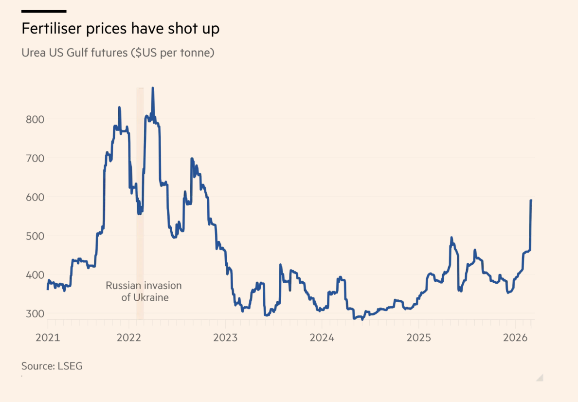 Prețurile îngrășămintelor au crescut deja brusc. Prețurile ureei granulate din Orientul Mijlociu au crescut cu aproximativ 130 de dolari, ajungând la aproximativ 575-650 de dolari pe tonă, de vineri, în timp ce prețurile de export egiptene au urcat cu aproximativ 125 de dolari, ajungând la aproximativ 610-625 de dolari pe tonă în aceeași perioadă, potrivit Argus.