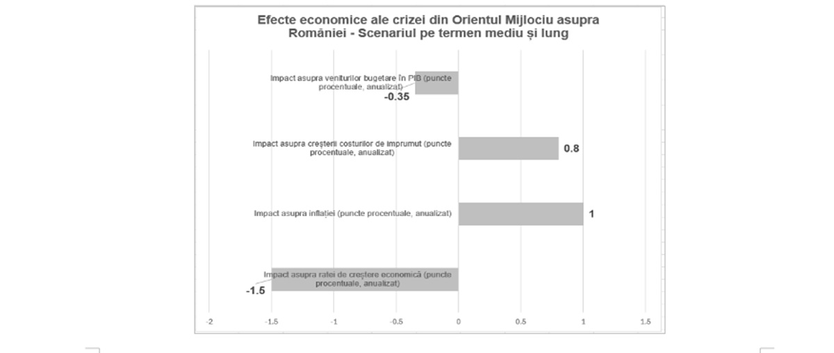 Pe termen mediu și lung (ipoteza unui șoc persistent, generat de durata și amplitudinea ridicate, plus 50% la prețul barilului de petrol), impactul asupra ratei de creștere economică ar putea fi de 1,5pp (față de scenariul baseline, fără criza din Orientul Mijlociu), asupra inflației de 1pp (efecte directe și indirecte plus presiunea pe deprecierea cursului), o creștere a costurilor de imprumut ale statului cu 60-80bps (0,6-0,8pp), o reducere a veniturilor bugetare în PIB de 0,25-0,35pp și o deteriorare mai puternică a balanței comerciale (față de scenariul pe termne scurt). (Infografic 2)