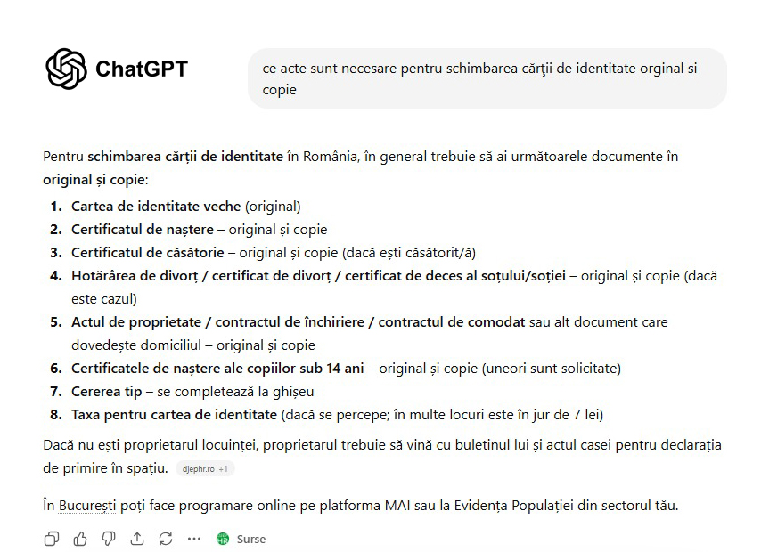 Însă, ne putem baza complet pe Inteligența Artificială în luarea deciziilor? Are întotdeauna dreptate? Am testat două dintre aceste instrumente, Gemini și ChatGPT, întrebându-le ce acte sunt necesare pentru schimbarea cărții de identitate, iar răspunsurile pot părea surprinzătoare.